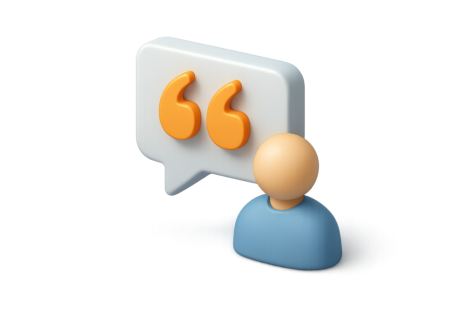 This image features a stylized 3D icon representing a testimonial. A simplified figure stands beside a speech bubble with orange quotation marks, set against a soft gradient background.
