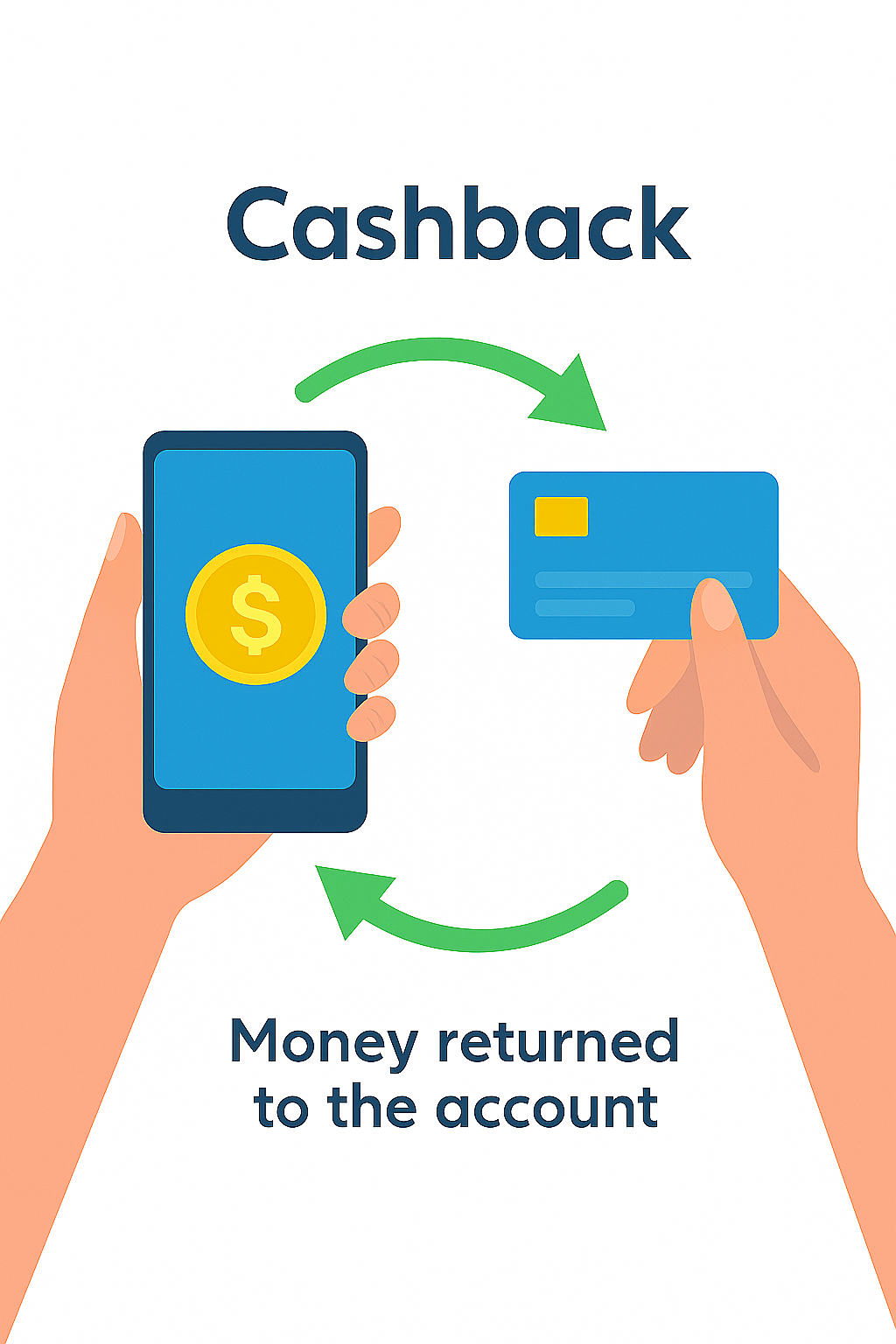 Vector graphic illustrating the cashback process, featuring a smartphone and credit card. Ideal for financial services marketing, showcasing mobile payment benefits.