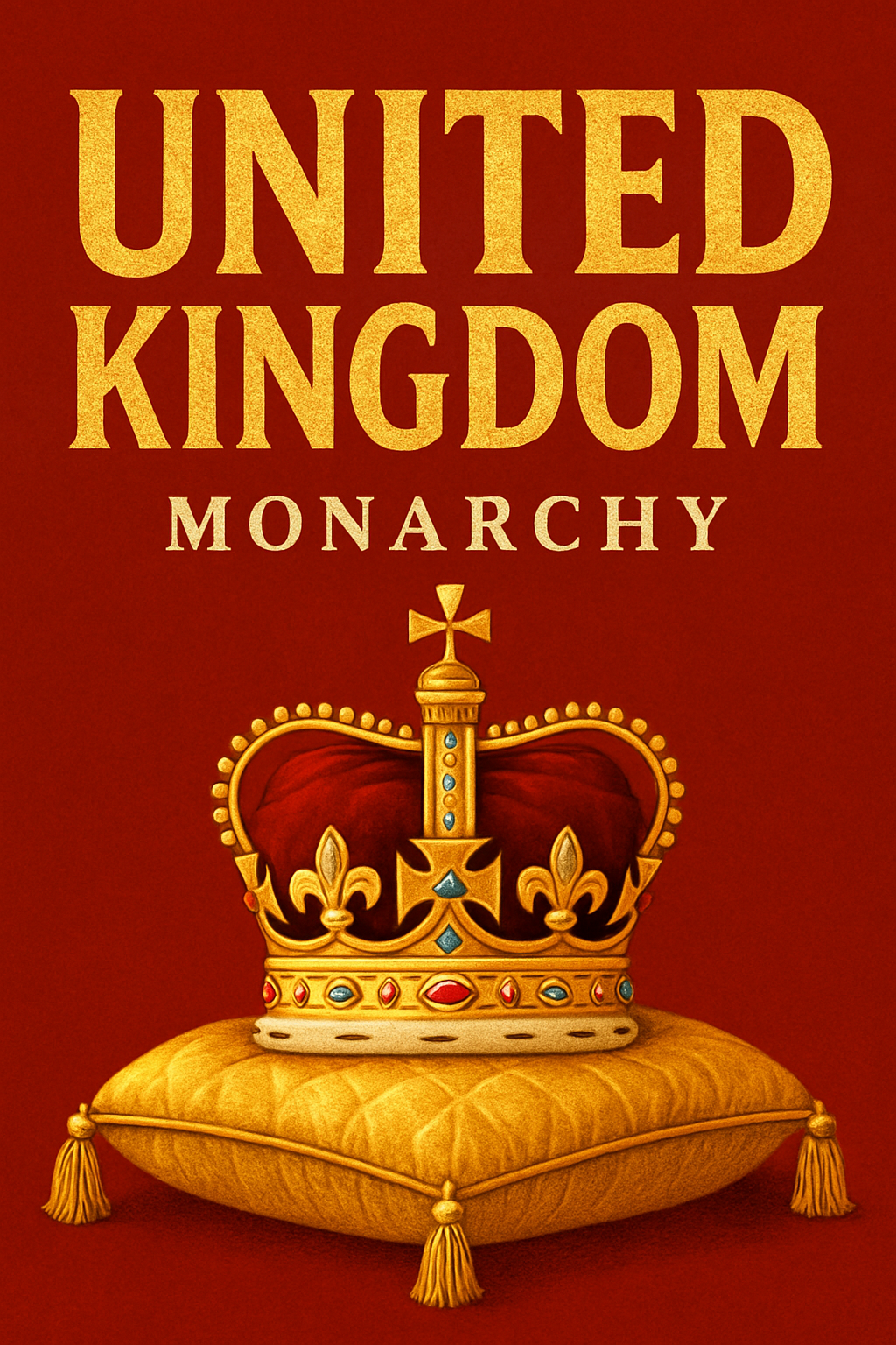 /Collection: /by davooda/Type: PNG/A visually striking illustration featuring a royal crown on a gilded cushion, symbolizing the British monarchy. The design utilizes rich colors and elegant typography, ideal for educational or promotional materials about royal history.