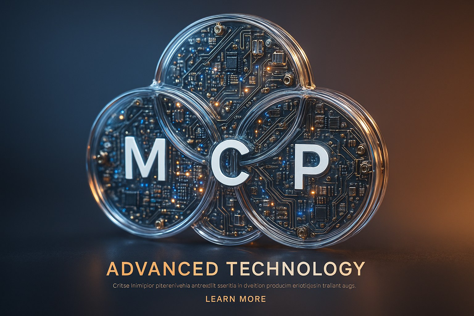 /Collection: /by davooda/Type: PNG/A hyperrealistic close-up of three overlapping circles featuring the letters M, C, and P. The surface is glass-like with glowing micro-LEDs and intricate metallic components, showcasing advanced technology.
