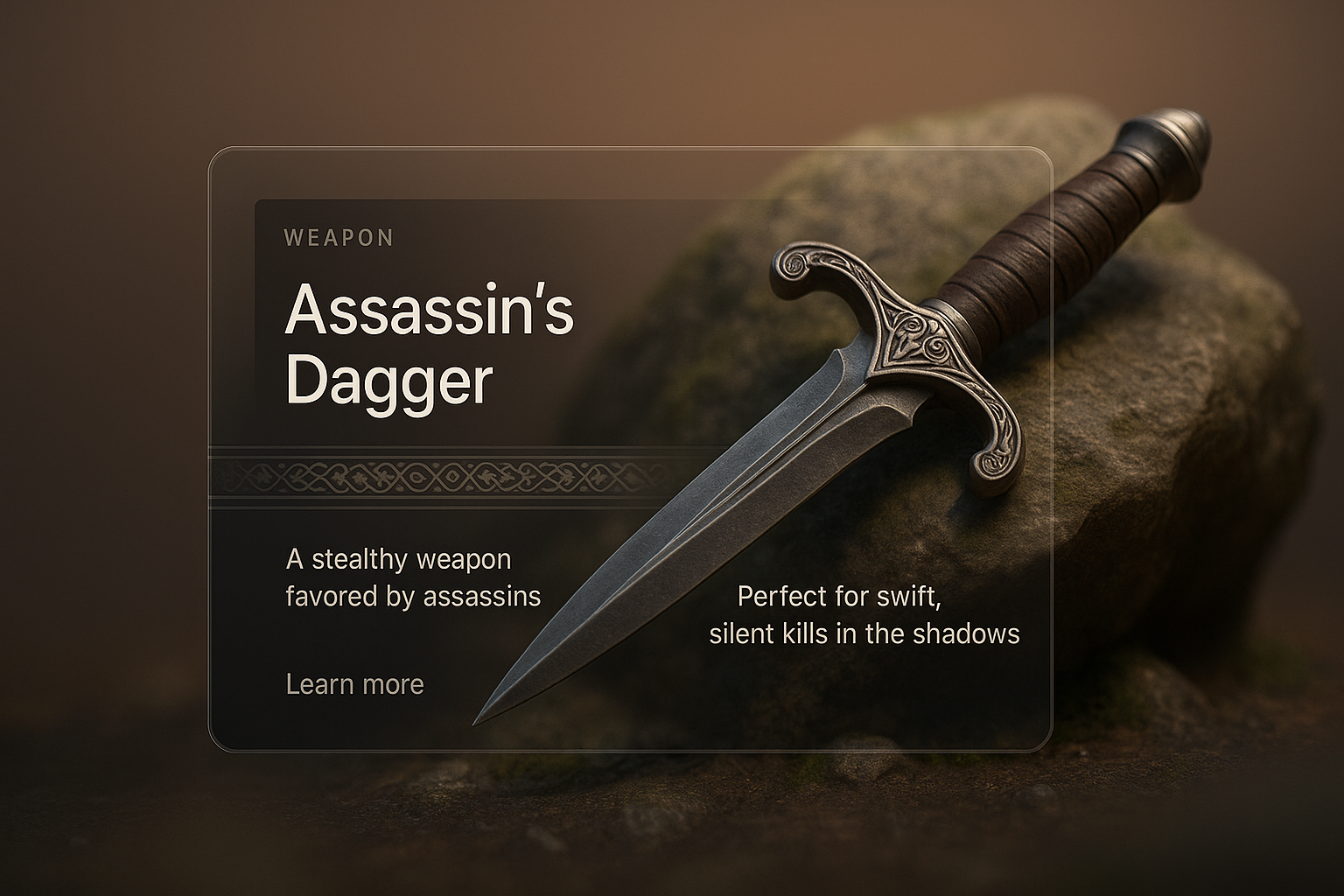 /Collection: /by davooda/Type: PNG/A detailed 3D illustration of an assassin's dagger, integrated with text blocks and a gradient background, showcasing a sleek and stealthy design suitable for web use.