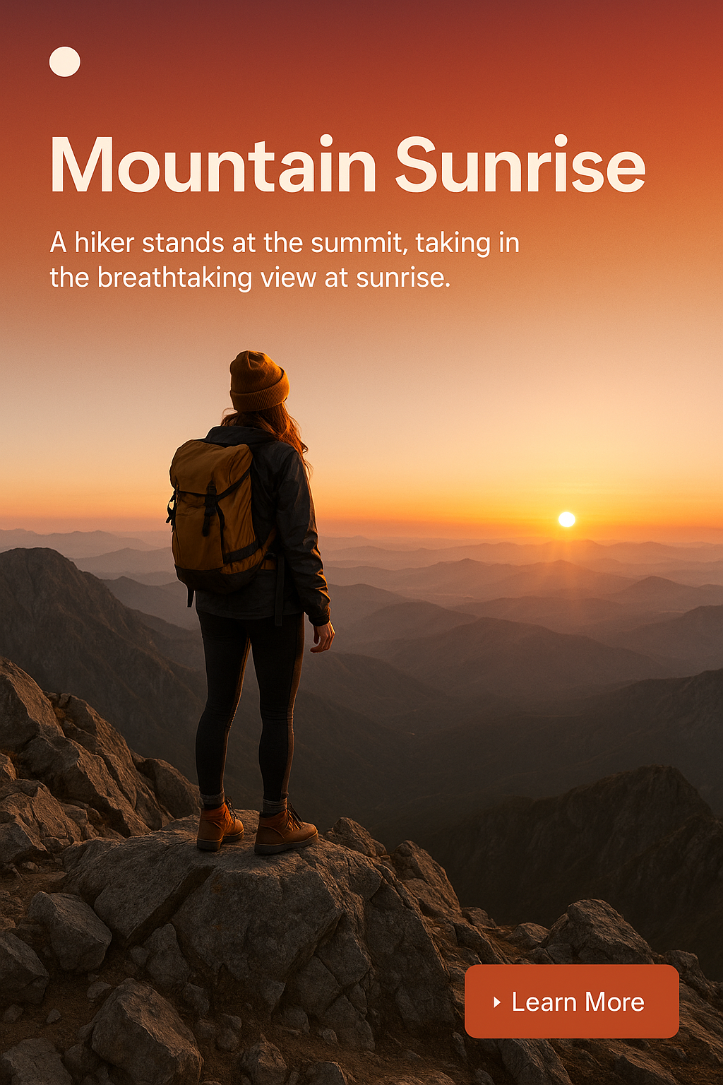 /Collection: /by davooda/Type: PNG/A female hiker stands triumphantly at the mountain summit, enjoying a stunning sunrise view. The warm colors of the sky contrast with the rugged mountain landscape.
