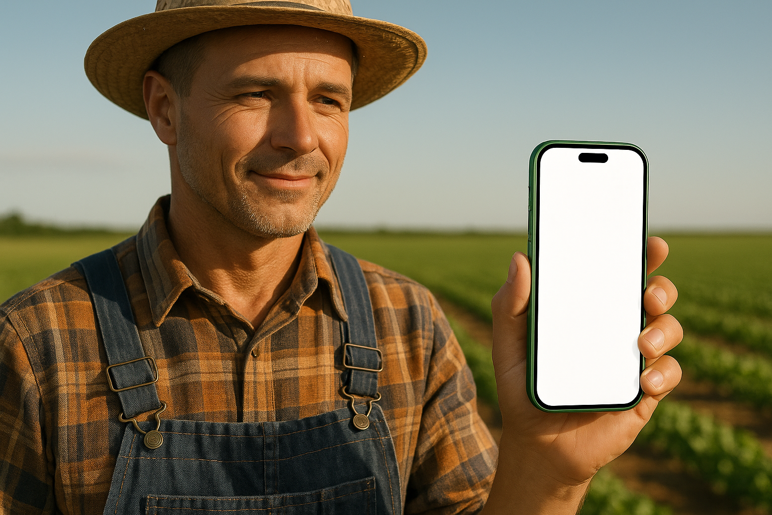 A male farmer in overalls smiles while holding a green phone against a backdrop of lush green fields. The phone screen is blank with rounded edges.