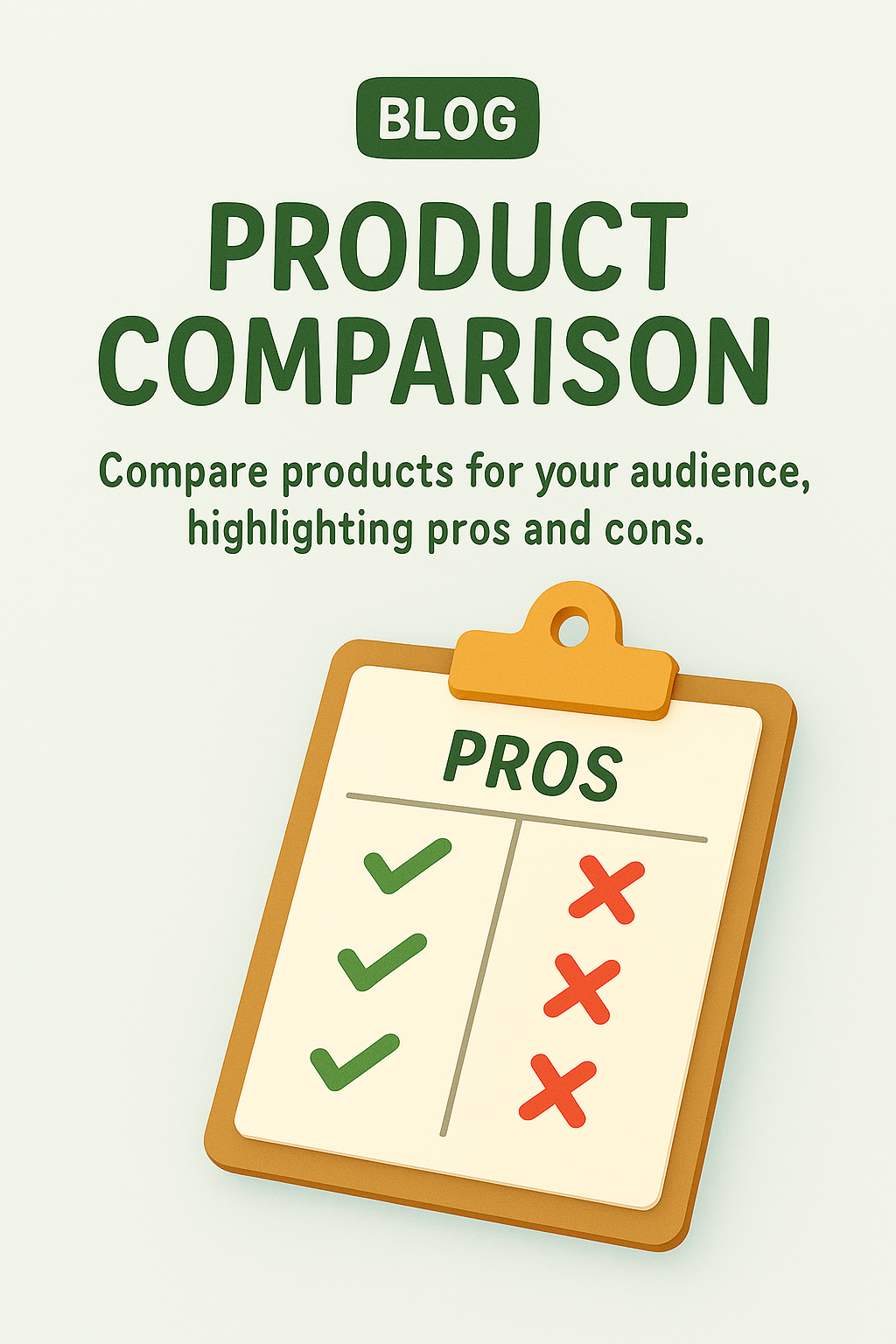 Illustrative blog graphic showcasing a product comparison clipboard with pros and cons, designed for engaging content that highlights product features.