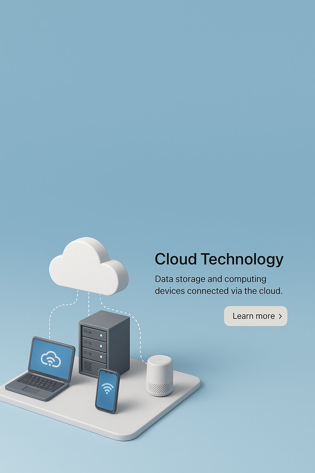 /Collection: /by davooda/Type: PNG/A visually appealing 3D illustration showcasing cloud technology. It features a cloud symbol, a laptop, a server, and smart home devices, all set against a smooth gradient background.