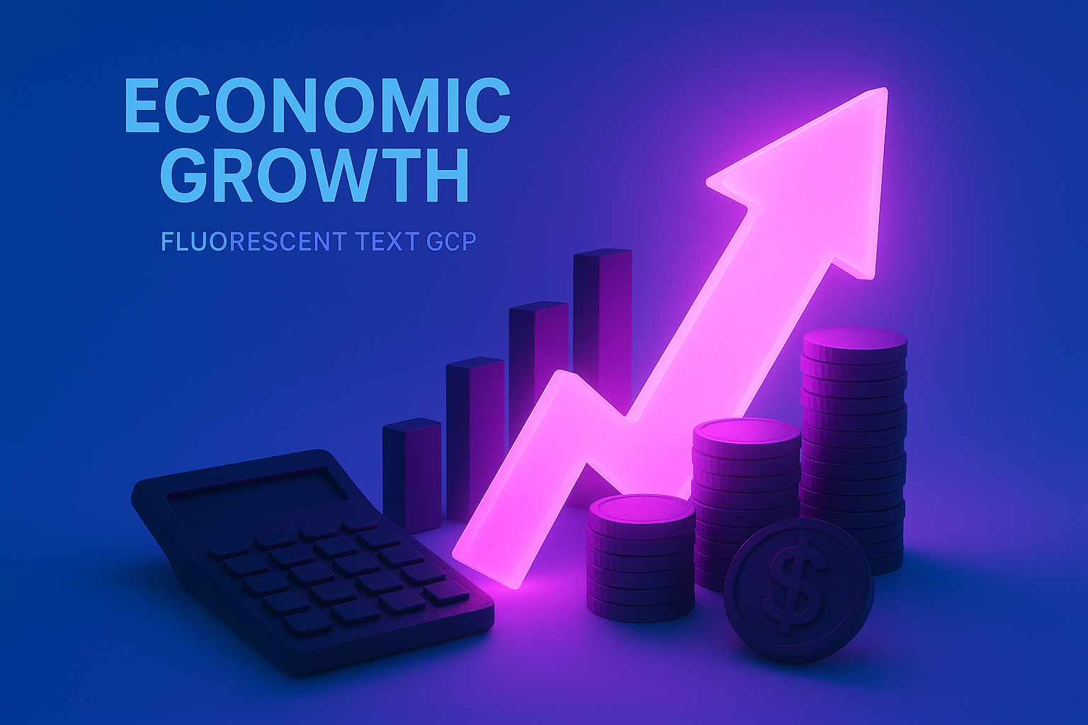 A vibrant scene featuring neon pink elements symbolizing economic growth. A glowing arrow points upwards, accompanied by stacks of coins and a calculator, illuminated against a solid blue background.