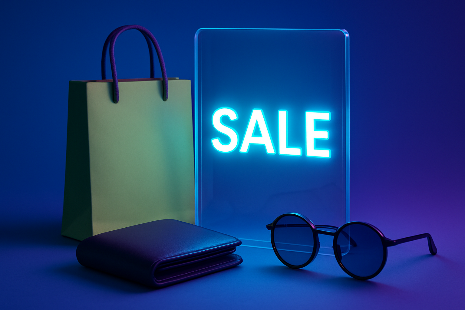 A vibrant composition featuring a glowing 'SALE' sign, a green shopping bag, a purple wallet, and stylish sunglasses, all set against a blue background.