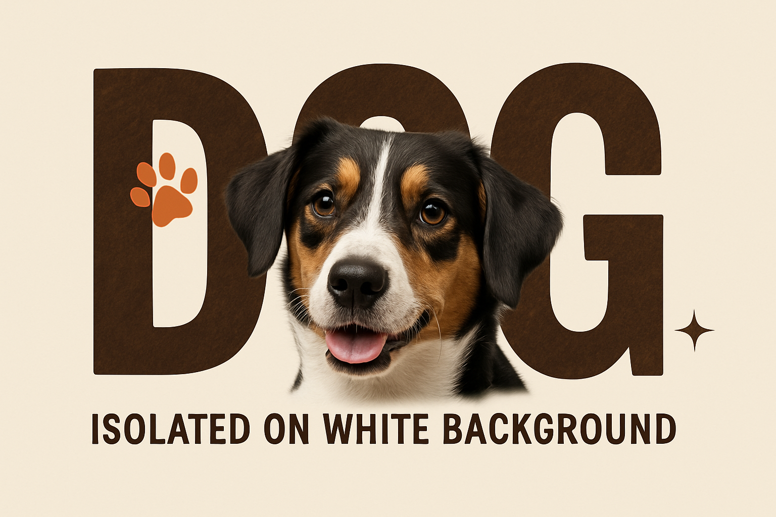 Charming graphic featuring a close-up of a dog with bold, playful typography. Ideal for pet-related branding or promotional materials.
