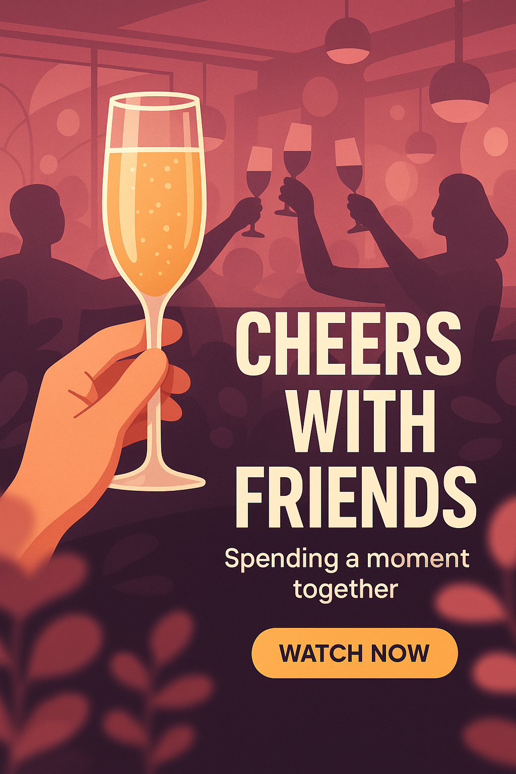 /Collection: /by davooda/Type: PNG/Vibrant social media post illustrating a toast among friends, featuring a hand holding a champagne glass. The warm color palette and modern design elements create an inviting atmosphere, perfect for promoting social gatherings.
