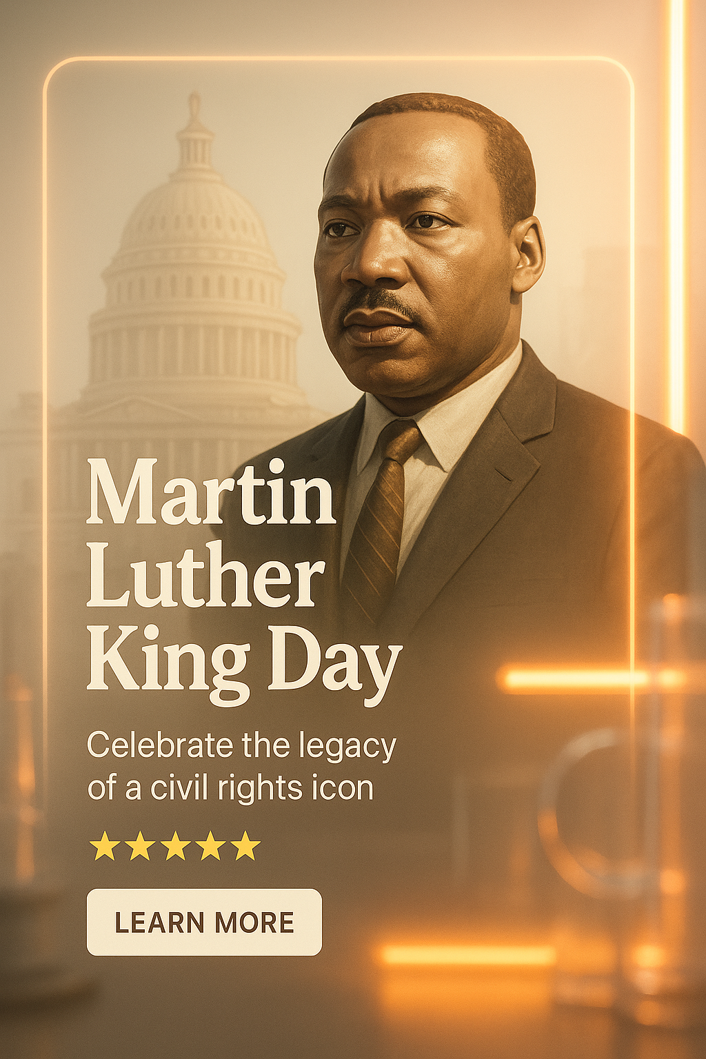 An engaging promotional graphic celebrating Martin Luther King Day, featuring a portrait of MLK with a modern design aesthetic, suitable for social media or event announcements.