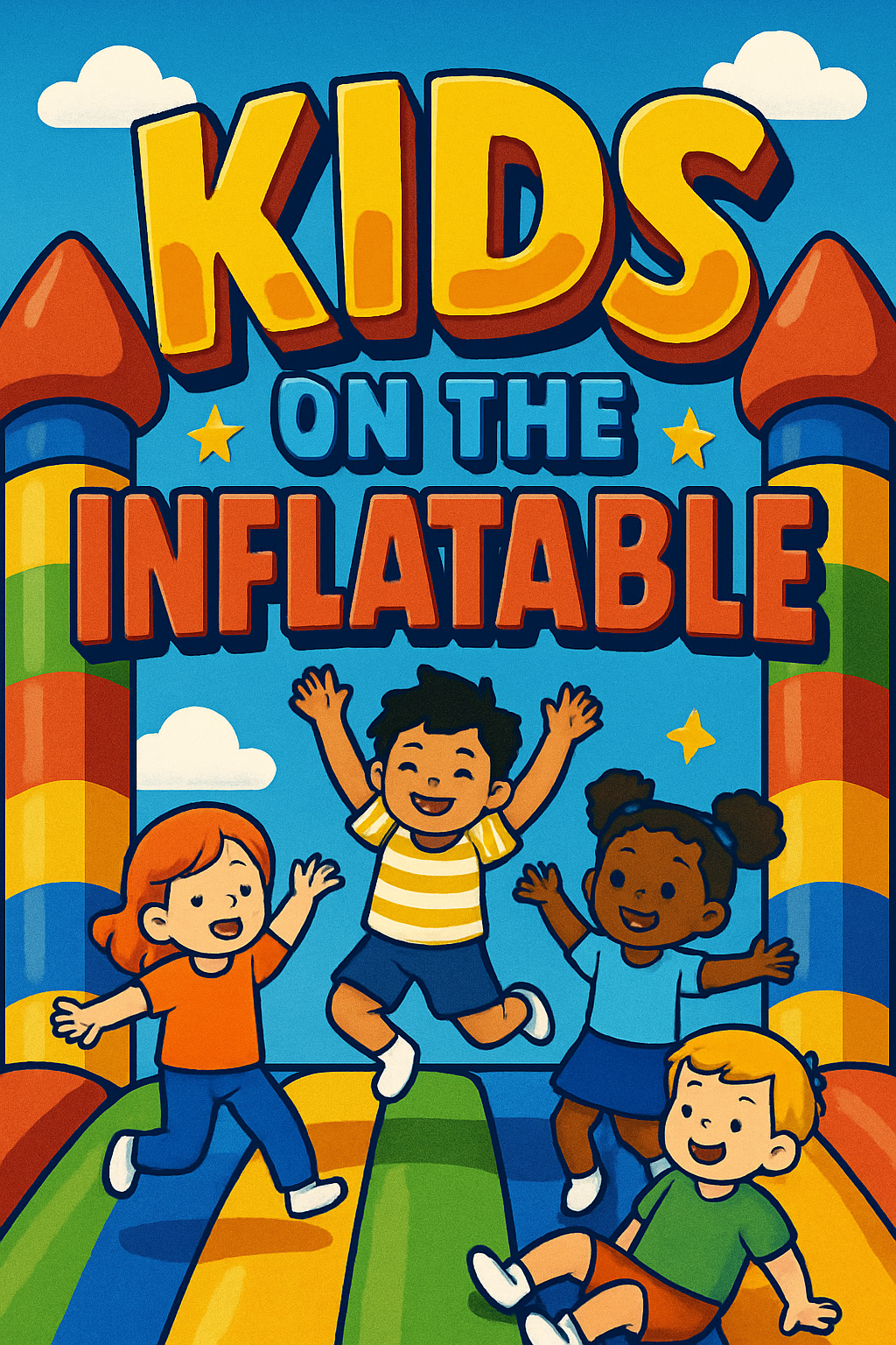 /Collection: /by davooda/Type: PNG/Vibrant and cheerful illustration depicting children joyfully playing on a colorful inflatable bounce house, ideal for children's event promotions or party invitations.