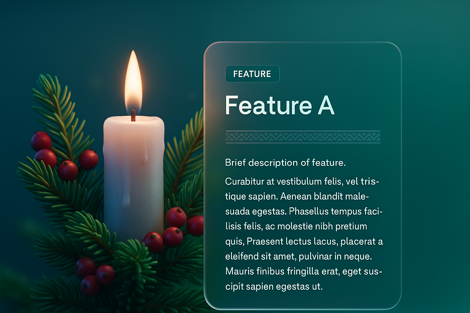 A close-up view of a lit candle surrounded by spruce branches and red berries, creating a cozy atmosphere. The background features a smooth gradient, enhancing the scene's warmth.