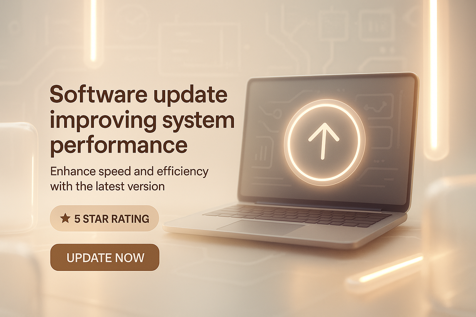 /Collection: /by davooda/Type: PNG/Modern promotional graphic featuring a laptop with a glowing update icon. Ideal for marketing software updates, showcasing performance enhancements with a sleek design.