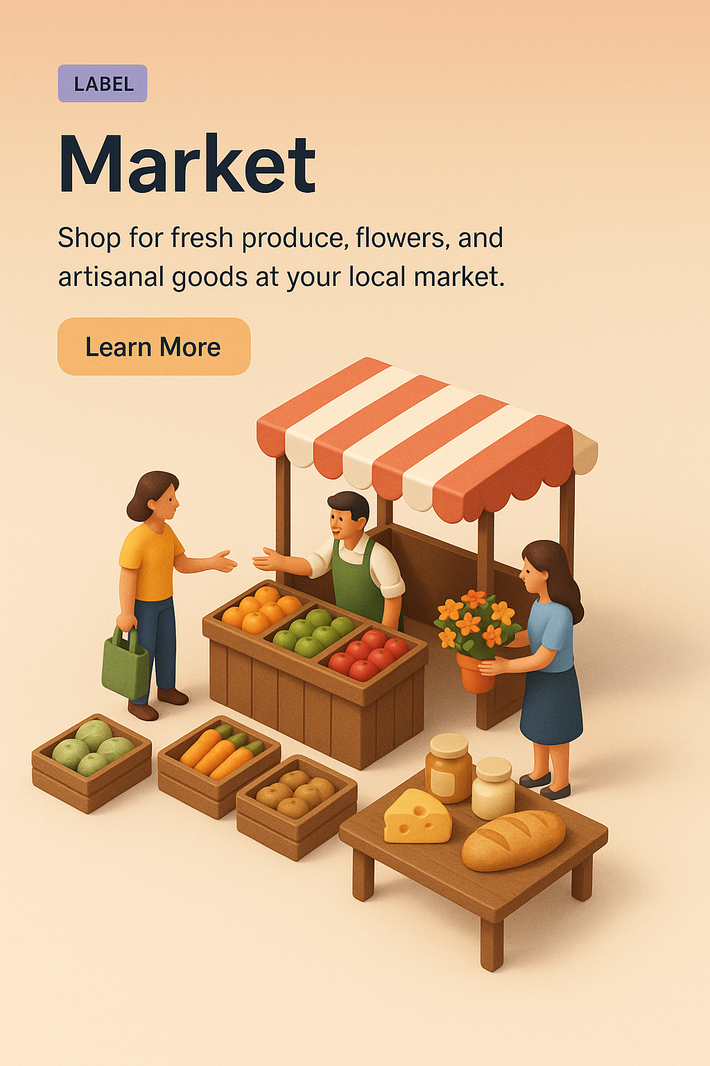 A zoomed-out 3D illustration of a vibrant market scene featuring stalls with fresh produce, flowers, and artisanal goods. The design includes a clear label, a brief text block, and an action button.