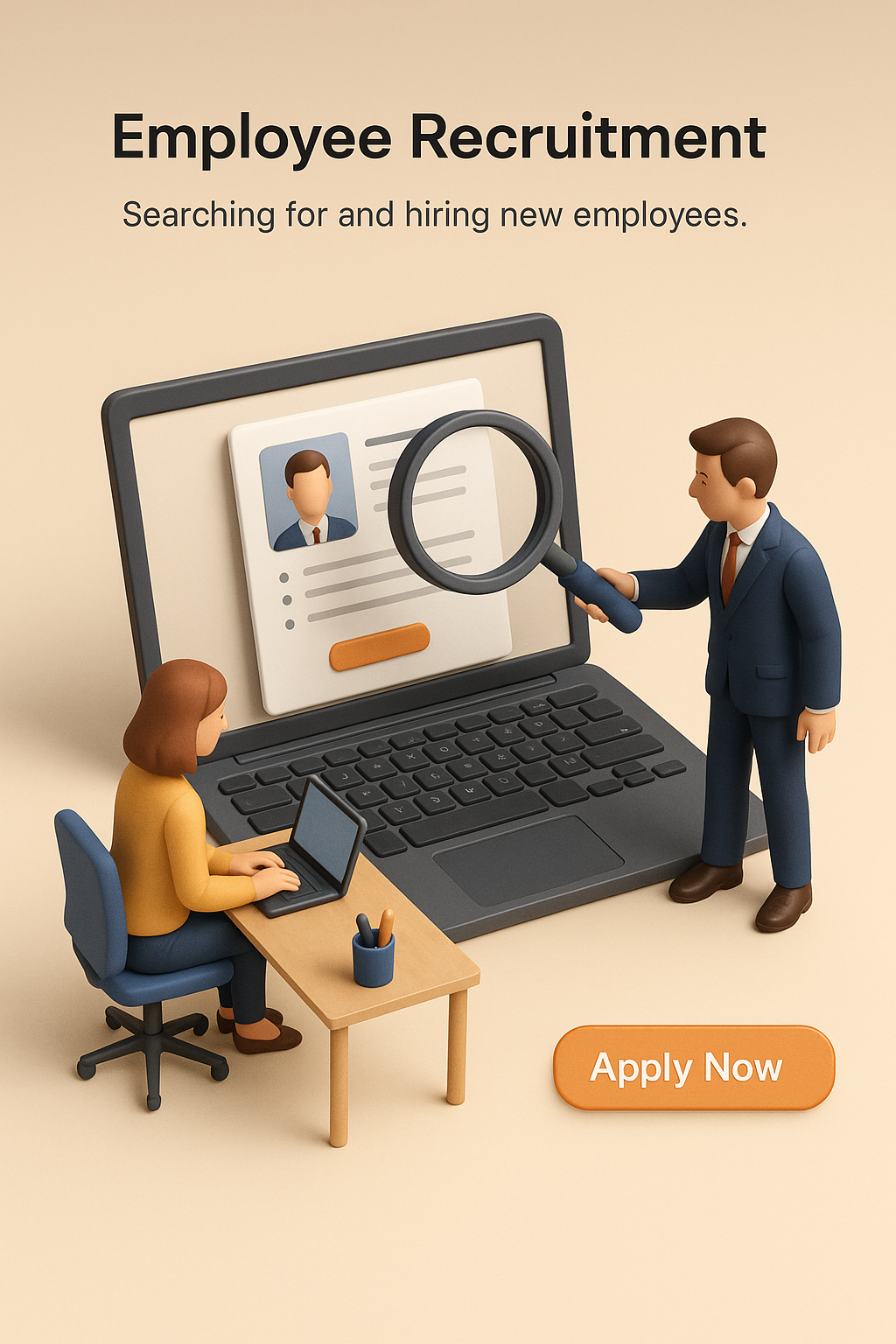 A detailed 3D illustration depicting a scene of employee recruitment, featuring a person at a desk and another with a magnifying glass examining a profile on a laptop. The design emphasizes a realistic style.