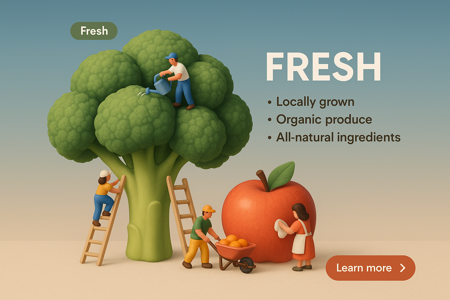 A detailed 3D scene depicting small characters interacting with fresh produce, including a tree and an apple. The background features a smooth gradient, enhancing the vibrant colors.