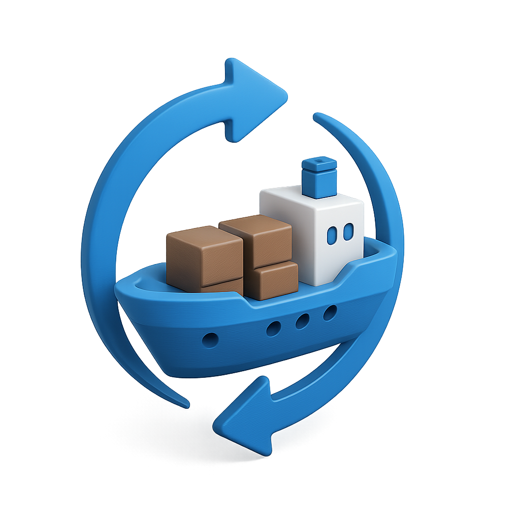 A vibrant 3D ship icon featuring a cargo ship surrounded by blue arrows, set against a subtle gradient background. The design reflects an isometric and volumetric style.