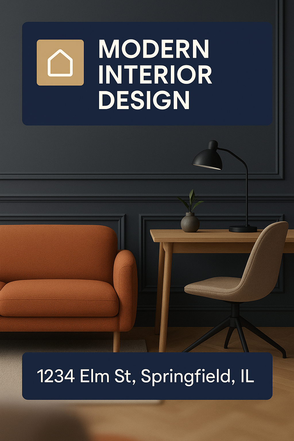 Stylish interior design graphic featuring a modern living room setup with a cozy sofa and desk, ideal for showcasing design services or home decor ideas.