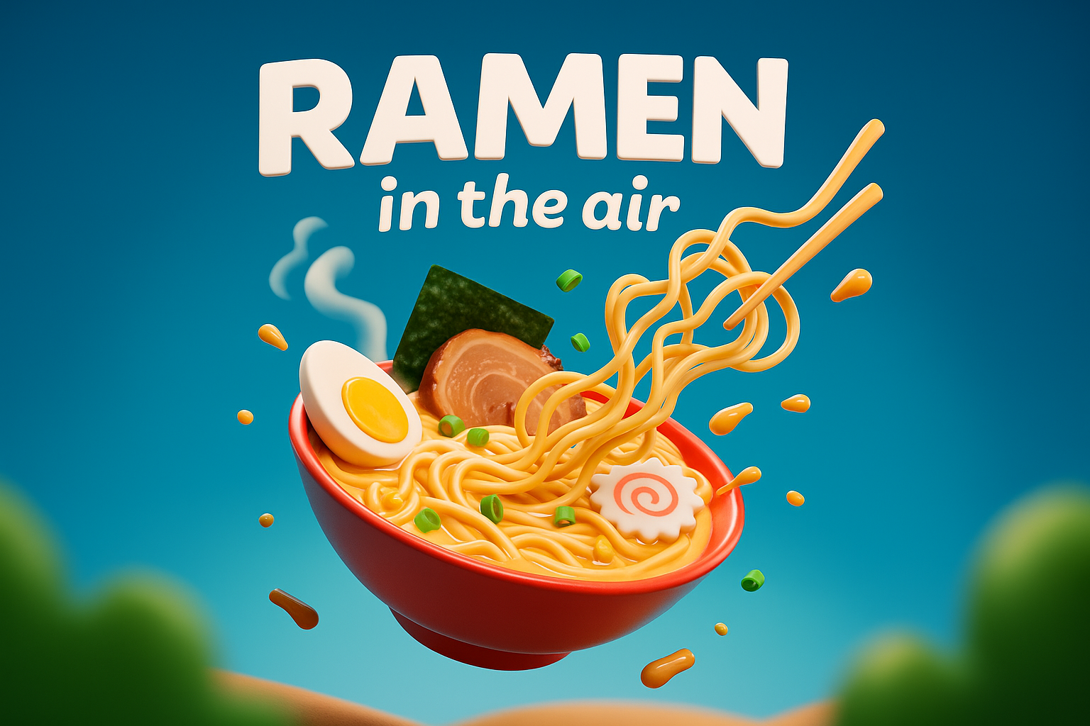 A vibrant 3D illustration showcasing ramen noodles suspended in mid-air, complete with toppings like egg, meat, and seaweed. The background features a smooth gradient, enhancing the dynamic feel.
