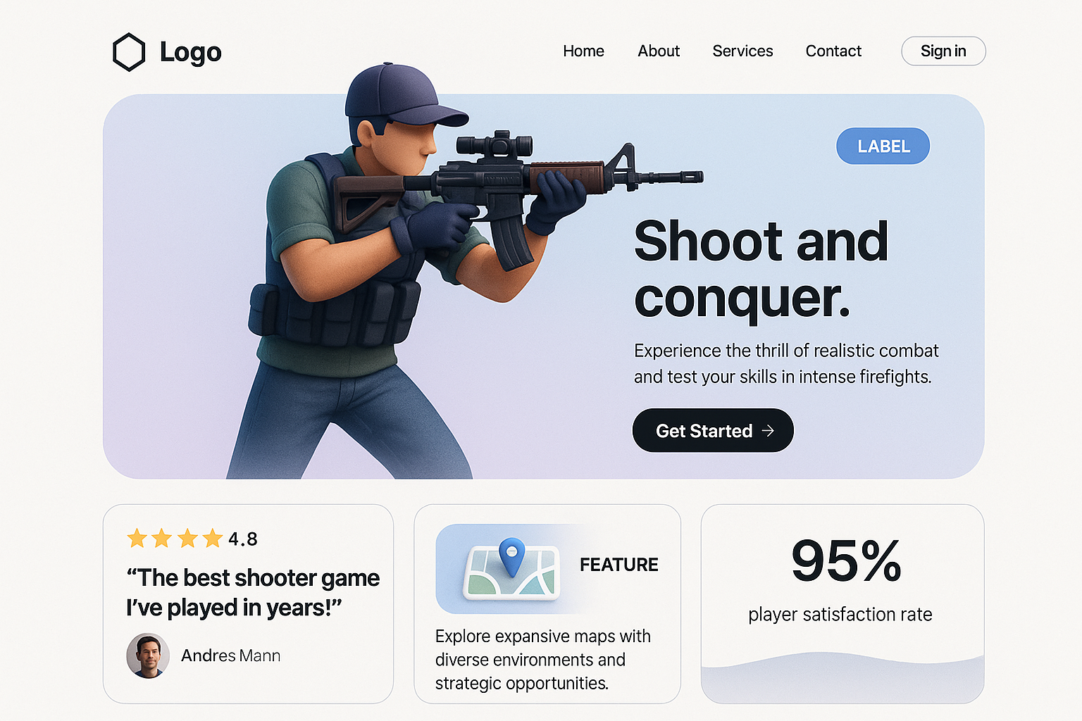 A visually engaging landing page design showcasing a shooter game theme with 3D elements, call-to-action buttons, and user testimonials.