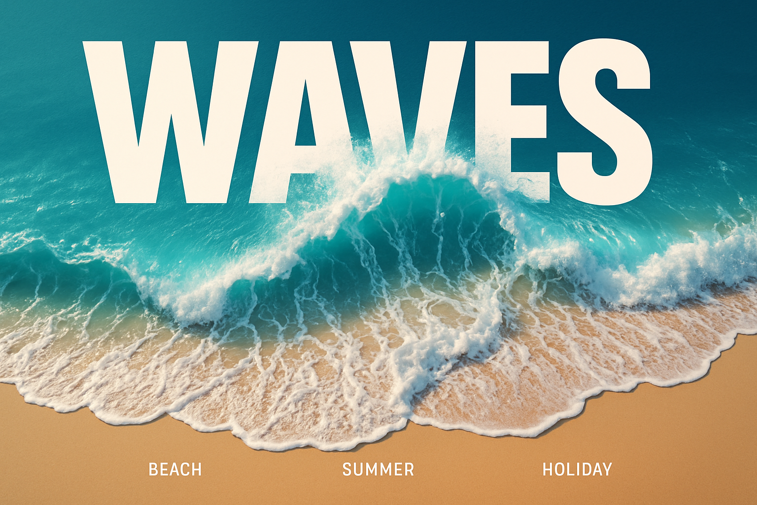 An aerial view of vibrant ocean waves crashing onto the sandy beach, featuring bold typography. The image combines a minimalistic style with striking details and a cinematic atmosphere.