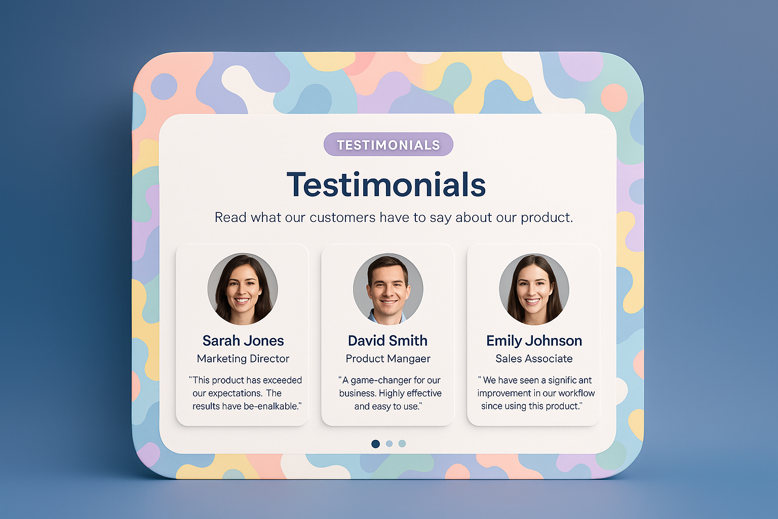A visually appealing testimonials section featuring three cards with user reviews. Each card includes a circular photo, name, position, and testimonial text, all set against a colorful abstract background.