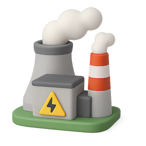 A playful, 3D-rendered factory icon showcasing energy production with smoke stacks, perfect for educational materials or environmental discussions.