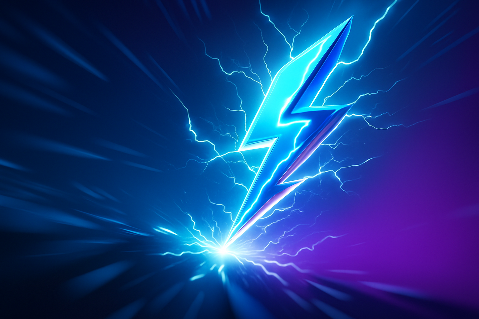 A striking 3D rendering of a lightning bolt with a dynamic composition. The design features vibrant blue and purple hues, emphasizing motion and energy.