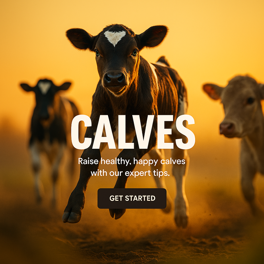 This image features calves in a warm, golden setting, designed to promote expert tips on raising healthy calves. It is ideal for agricultural marketing.
