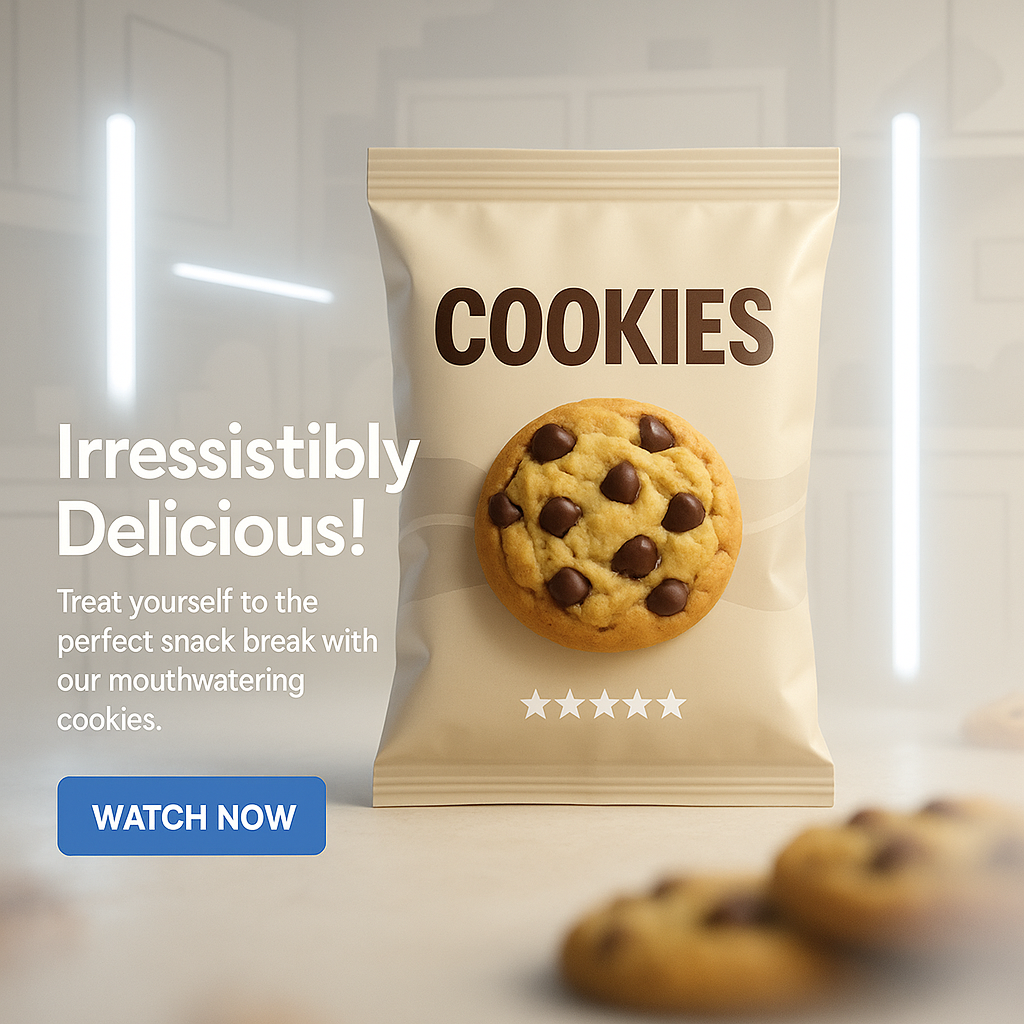 /Collection: /by davooda/Type: PNG/A visually appealing promotional graphic for cookies, showcasing a cookie package with a delicious cookie in the center. Ideal for social media marketing or product advertising.