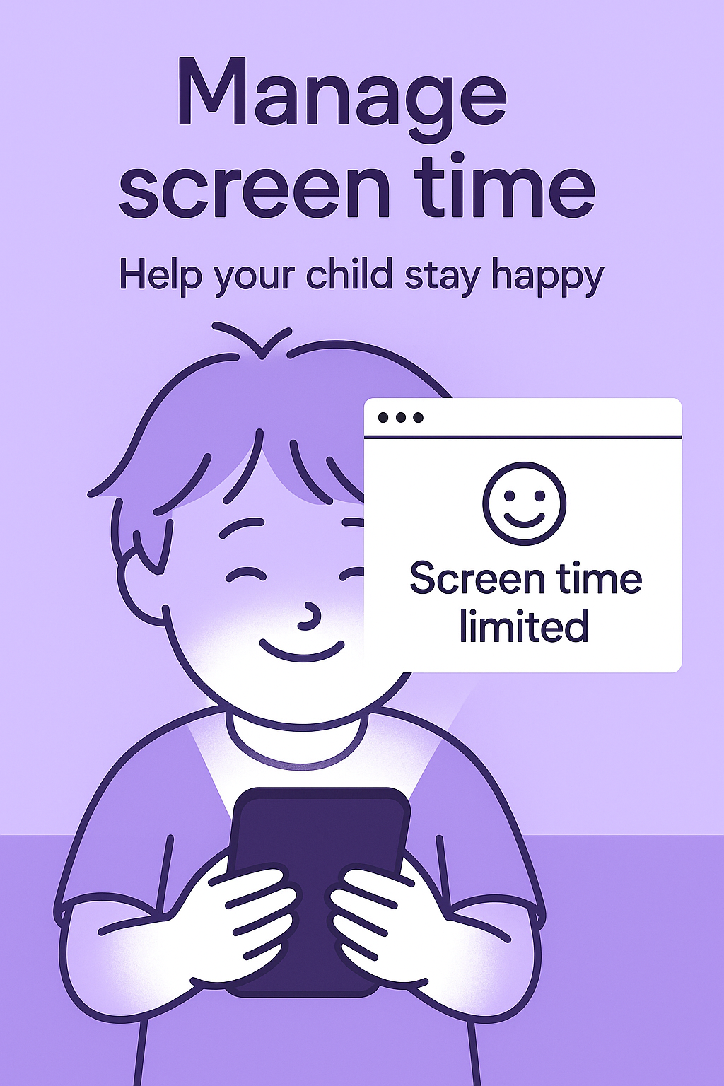 Illustrative graphic promoting screen time management for children, featuring a happy child using a smartphone. Ideal for parenting resources and educational materials.