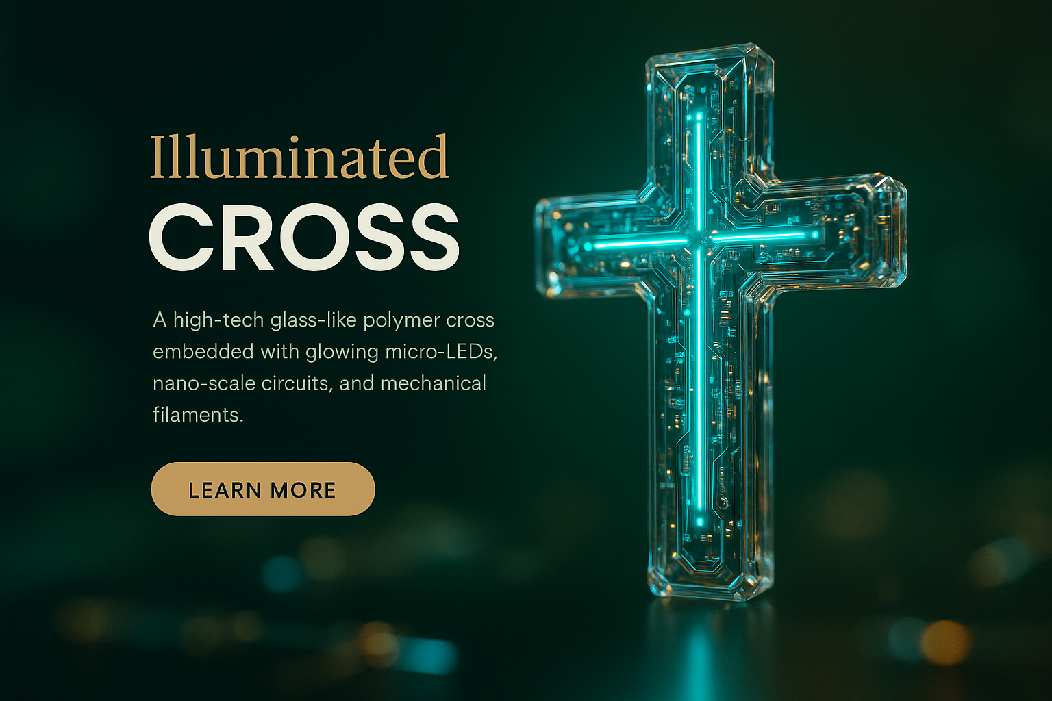/Collection: /by davooda/Type: PNG/This image features a hyperrealistic illuminated cross made of glass-like polymers, showcasing intricate internal designs with glowing micro-LEDs and metallic components. The scene is enhanced by soft neon lighting.