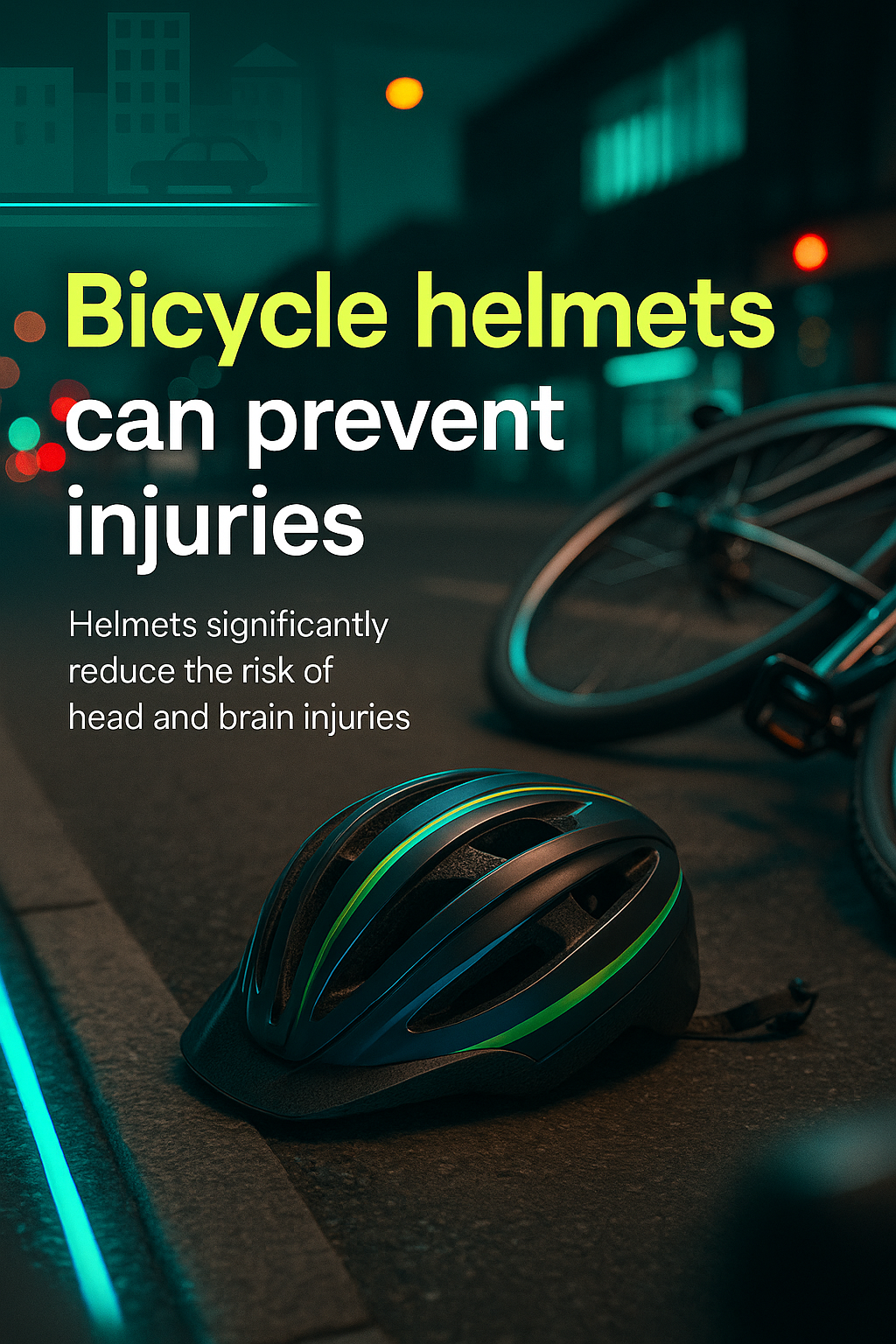 Engaging promotional image emphasizing the importance of bicycle helmets for safety. The modern design features a helmet on a road, appealing to cyclists and safety advocates.