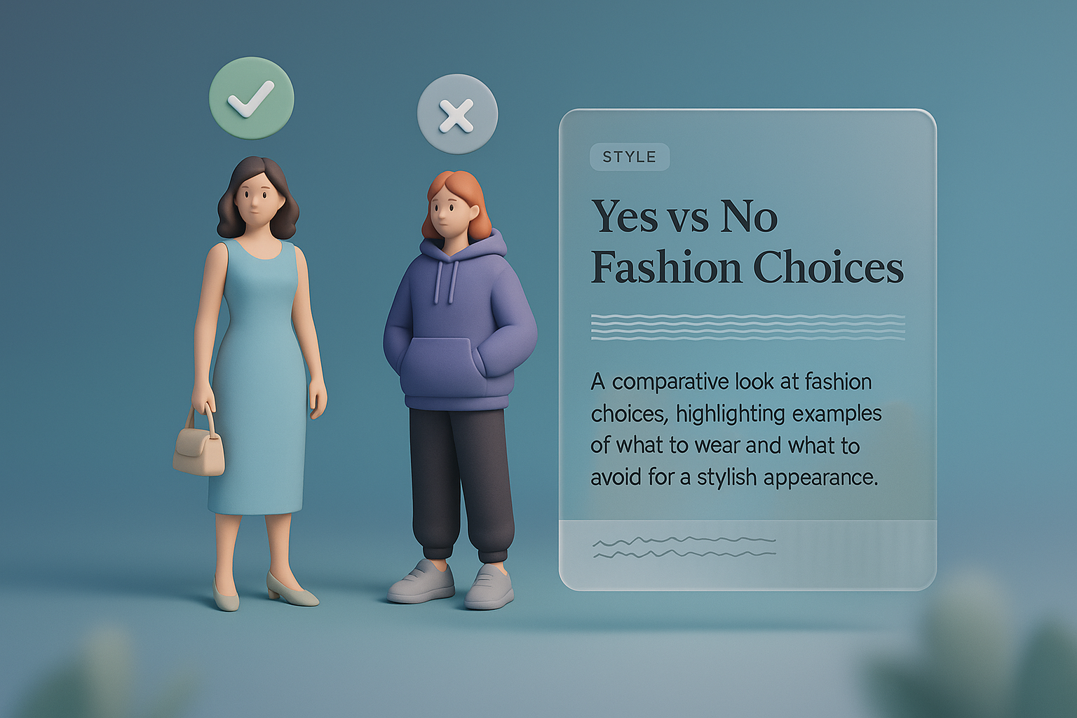 A 3D illustration depicting two characters representing style choices, with a transparent block containing text about fashion do's and don'ts.