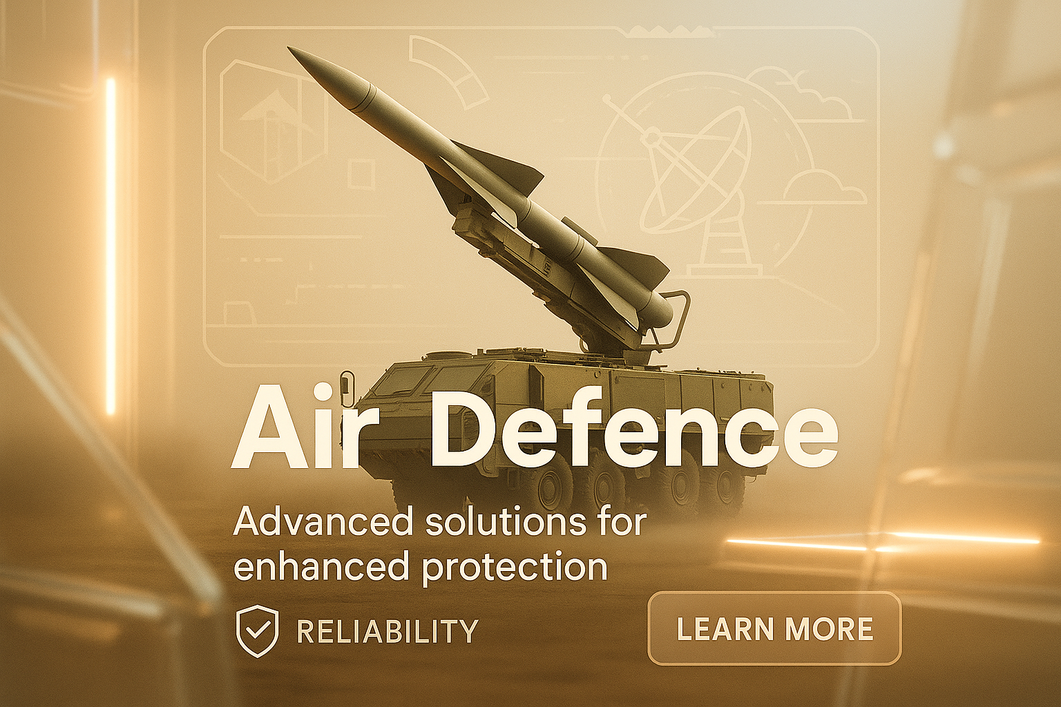 Futuristic promotional banner showcasing an air defense system, blending technology and military themes, ideal for defense industry marketing.