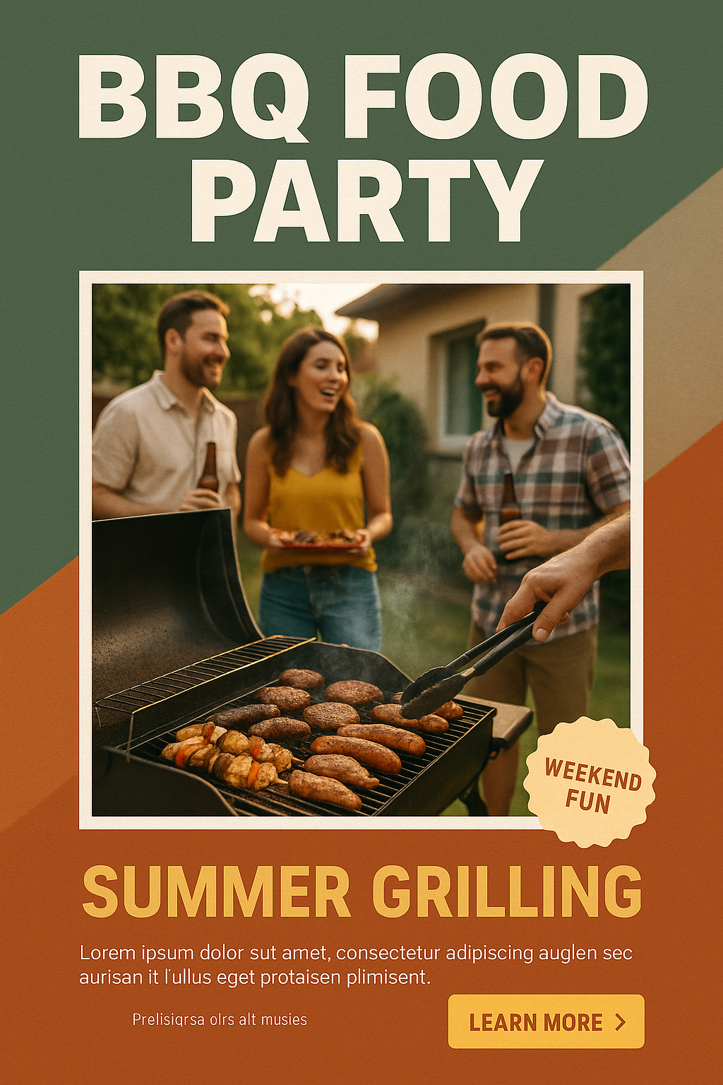 An inviting summer BBQ scene featuring friends enjoying grilled meat. The vibrant colors and layered design elements create a festive atmosphere perfect for weekend gatherings.