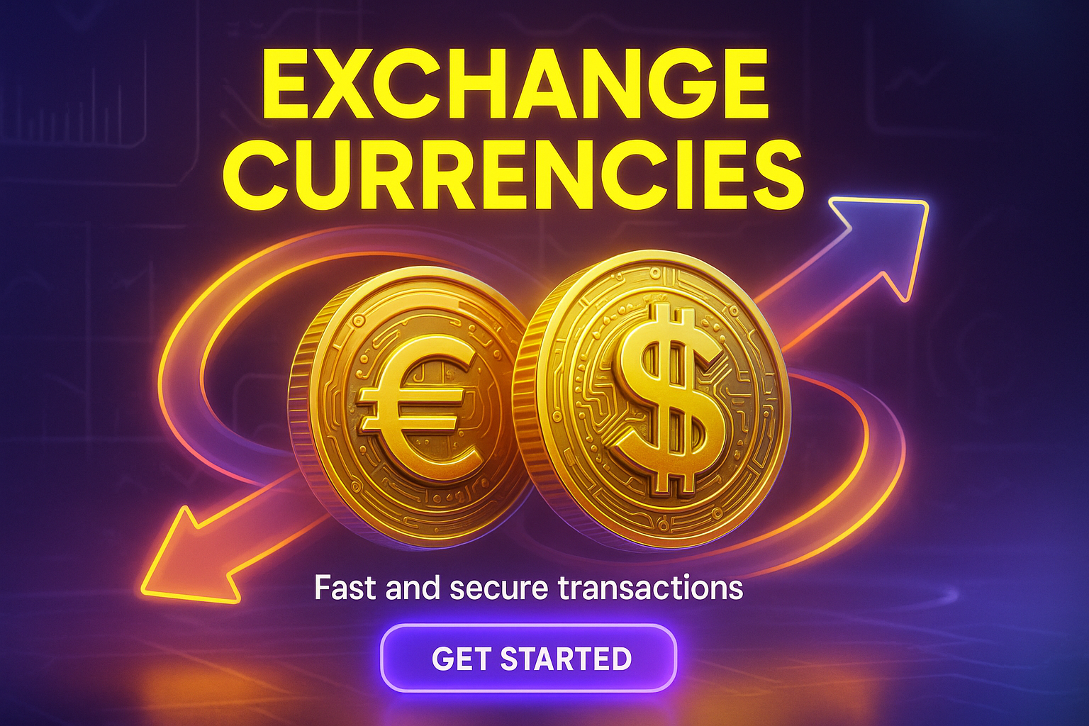 Vibrant promotional graphic for currency exchange services featuring gold coins and arrows, designed to attract users looking for fast and secure transactions.