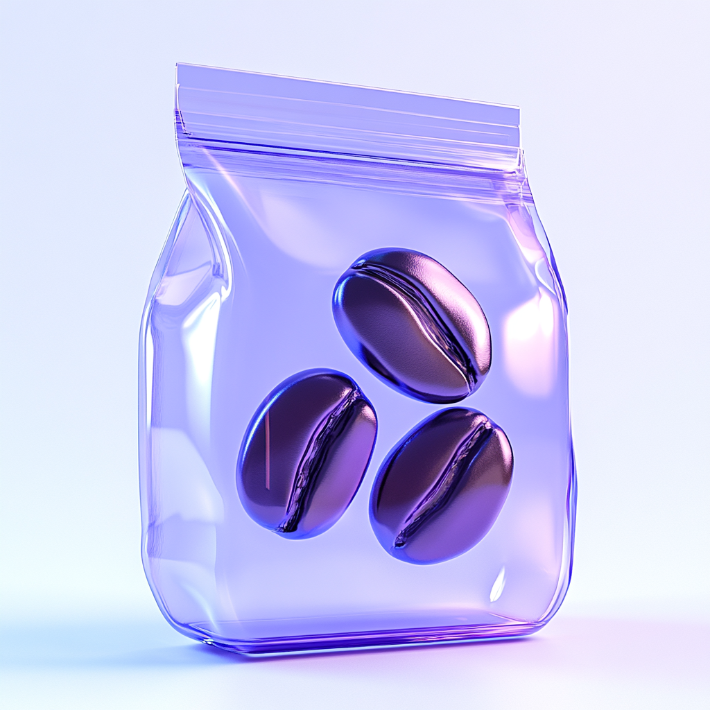 A visually appealing 3D rendering of a transparent coffee bean bag showcasing three beans. The modern aesthetic and vibrant colors make it suitable for branding and product marketing.