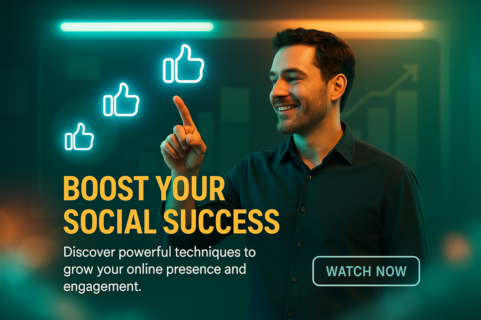 /Collection: /by davooda/Type: PNG/Dynamic promotional graphic designed to encourage audience engagement with a focus on social media success techniques. Features a modern aesthetic with vibrant colors.