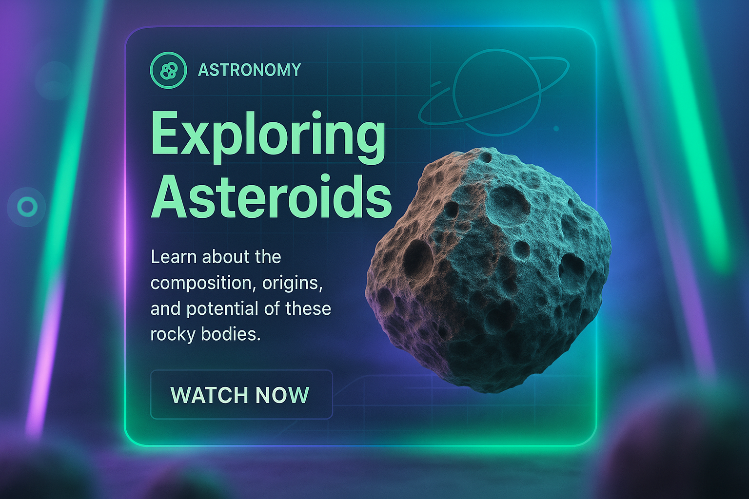 Visually engaging graphic focused on asteroid exploration, featuring 3D elements and vibrant neon colors, ideal for educational content and online courses.