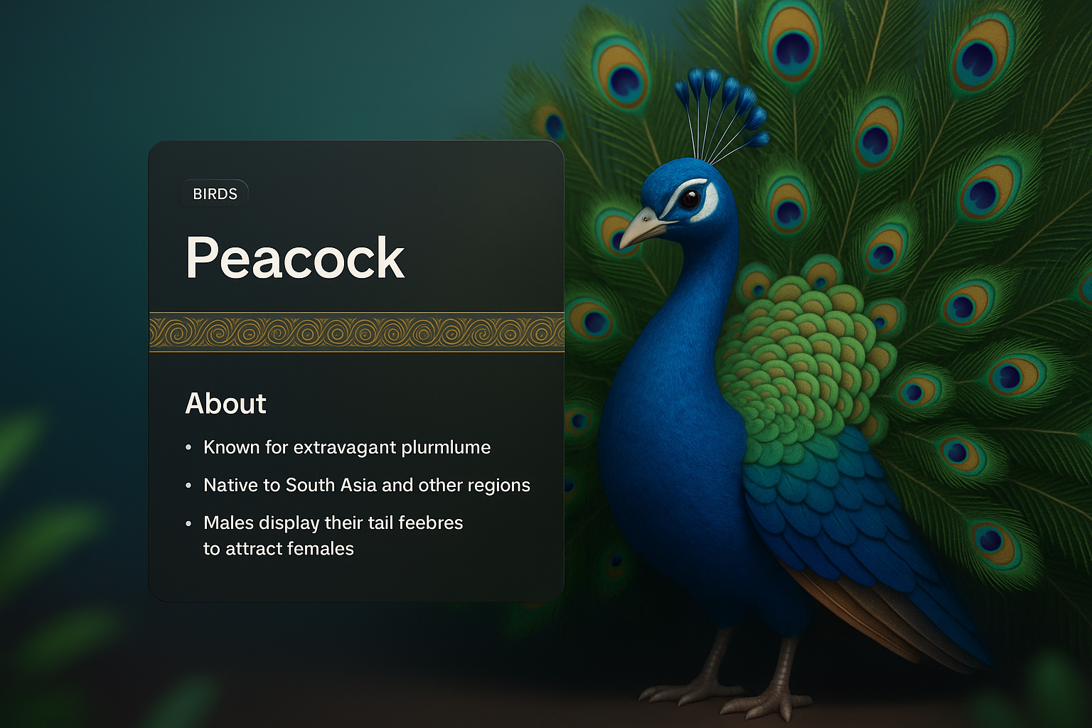 A captivating 3D illustration of a peacock featuring vibrant feathers and an integrated informational block. The design includes a gradient background and detailed text elements.