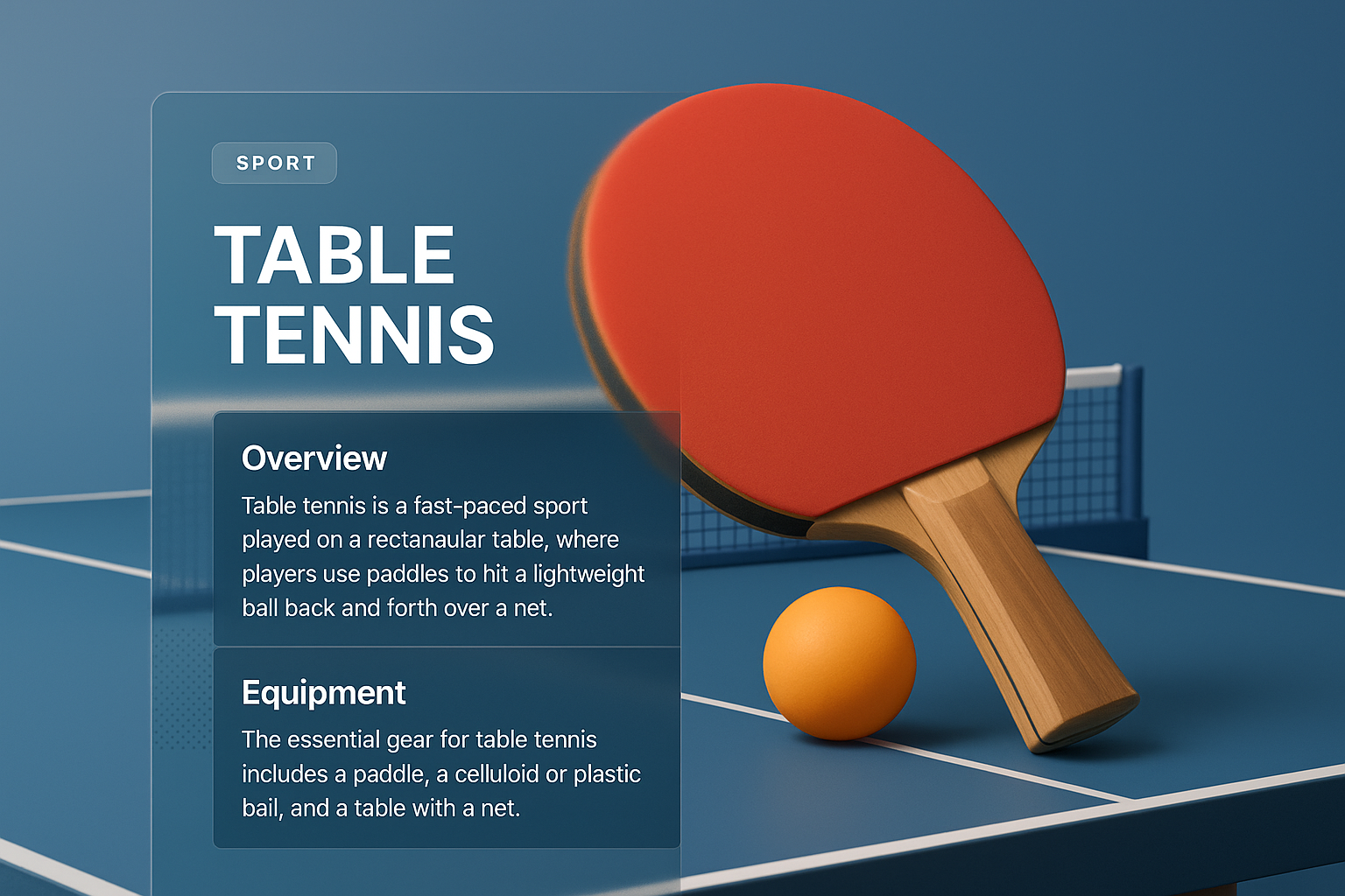 A visually appealing web page design featuring a 3D table tennis paddle and ball. Includes a transparent overlay with details about the sport, enhancing the overall aesthetic.