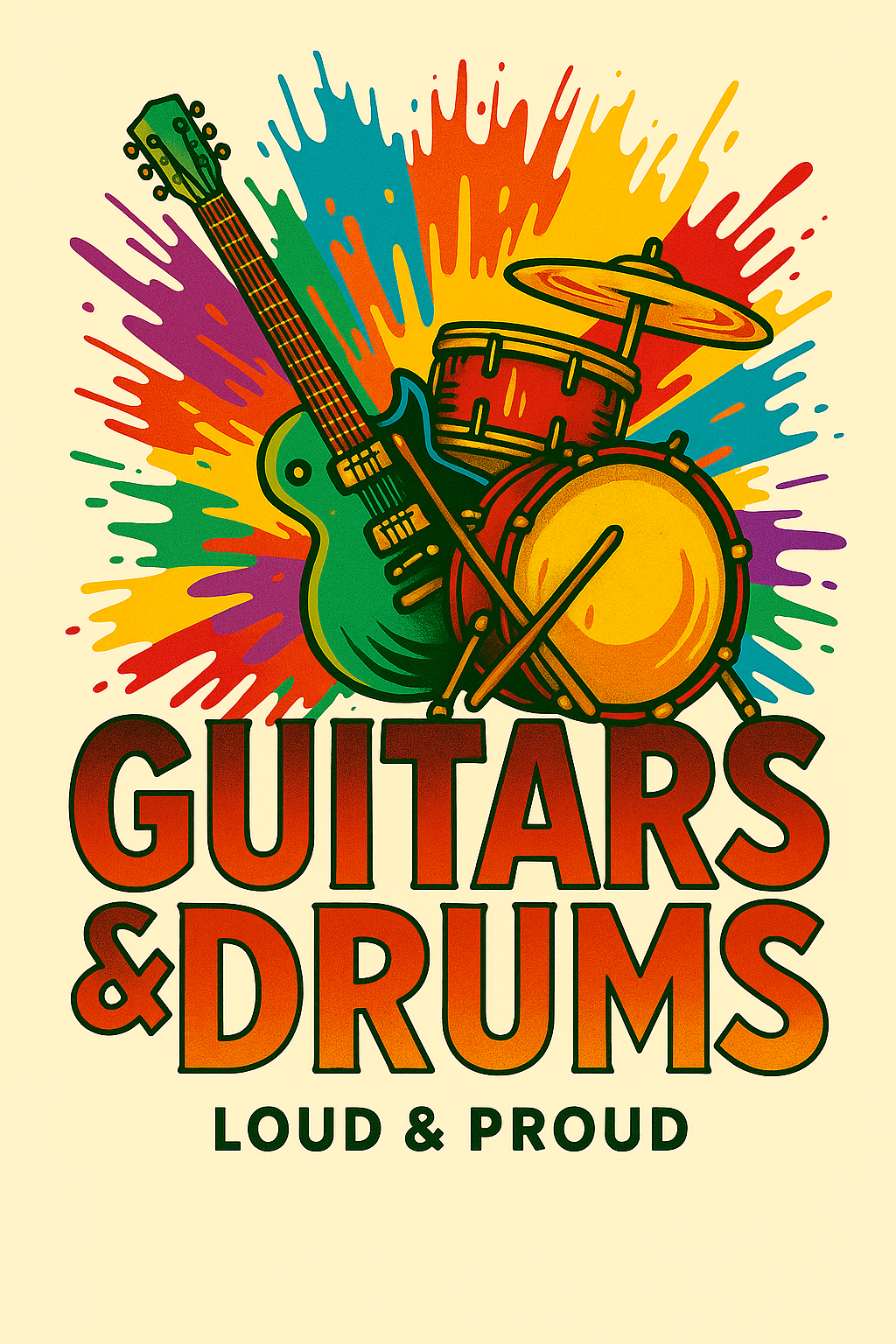 Vibrant Music-Themed Graphic Featuring Guitars and Drums