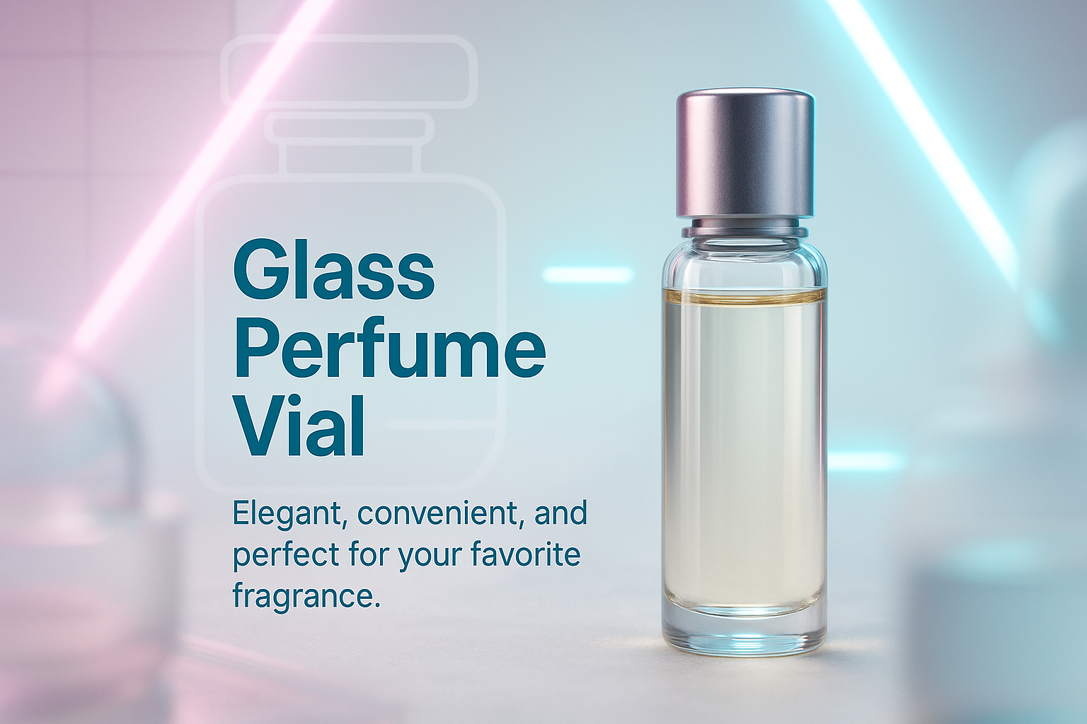 A stylish glass perfume vial showcased with modern lighting effects, ideal for product promotion or branding in the fragrance industry.