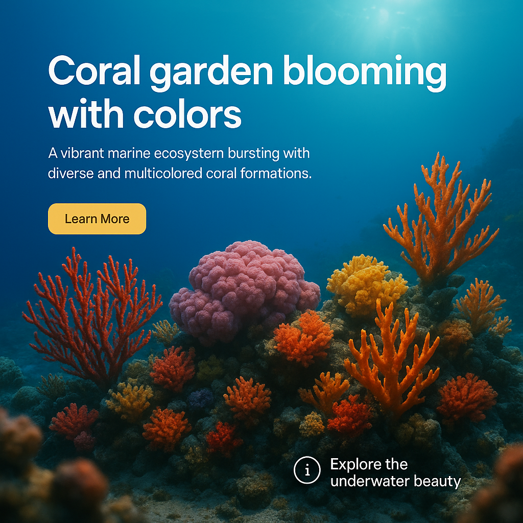 A stunning underwater scene showcasing a vibrant coral garden with diverse marine life. Text elements invite exploration of the underwater beauty.