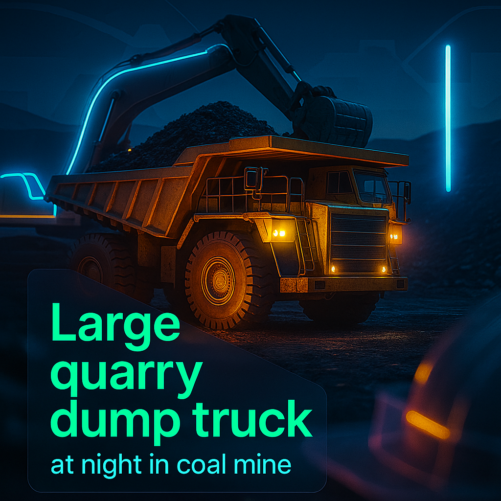 /Collection: /by davooda/Type: PNG/A detailed 3D rendering of a large dump truck operating in a coal mine during nighttime. The image features dramatic lighting and a futuristic aesthetic, suited for mining industry visuals or promotional materials.
