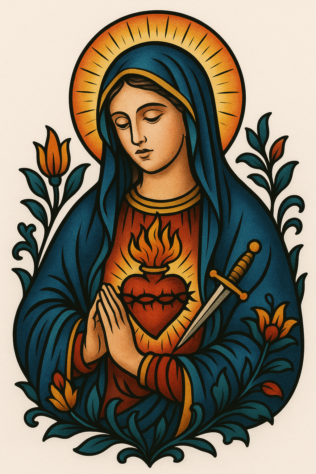 Vibrant Tattoo Style Illustration of a Saint with Roses