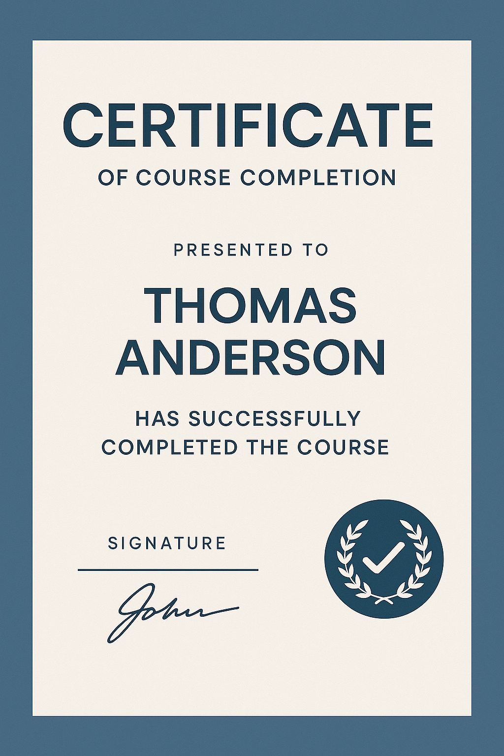 Elegant certificate design showcasing course completion with a modern layout, ideal for educational institutions and online courses.