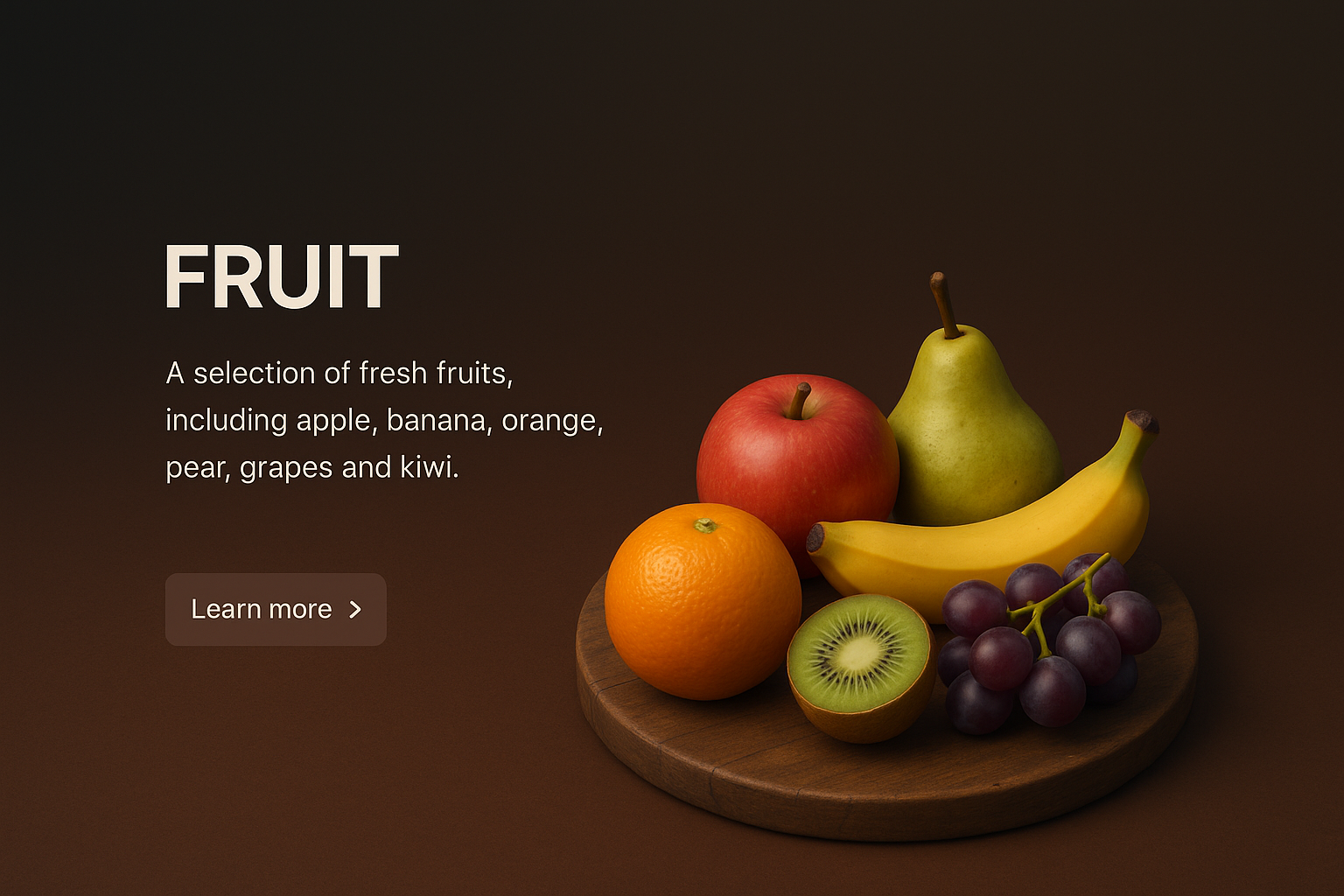 /Collection: /by davooda/Type: PNG/A detailed 3D scene featuring a variety of fresh fruits on a wooden surface, with a dark gradient background. The arrangement includes apples, bananas, oranges, and more, complemented by text labels and a call-to-action button.