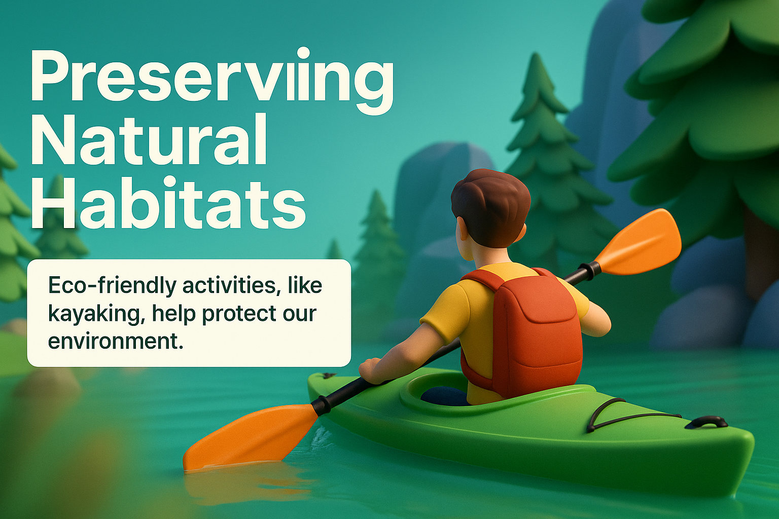 /Collection: /by davooda/Type: PNG/A vibrant 3D illustration depicting a person kayaking in a serene environment, emphasizing the importance of eco-friendly activities in preserving natural habitats.